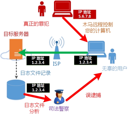 地址发起的任何非法通信有责任。最近在日本,执法者的可耻事件做为严重的问题被批评,执法人员错误地逮捕了从来没有在他的电脑上进行非法事情的无辜互联网用户,而是电脑感染了木马,被真正的犯人远程控制。真正的犯人让无辜的互联网用户的计算机发送敲诈邮件给一些公司,无辜的人被执法人员不公正地逮捕。无辜的人最终被释放,但这是在日本近代历史上最糟糕的诬告事件之一。